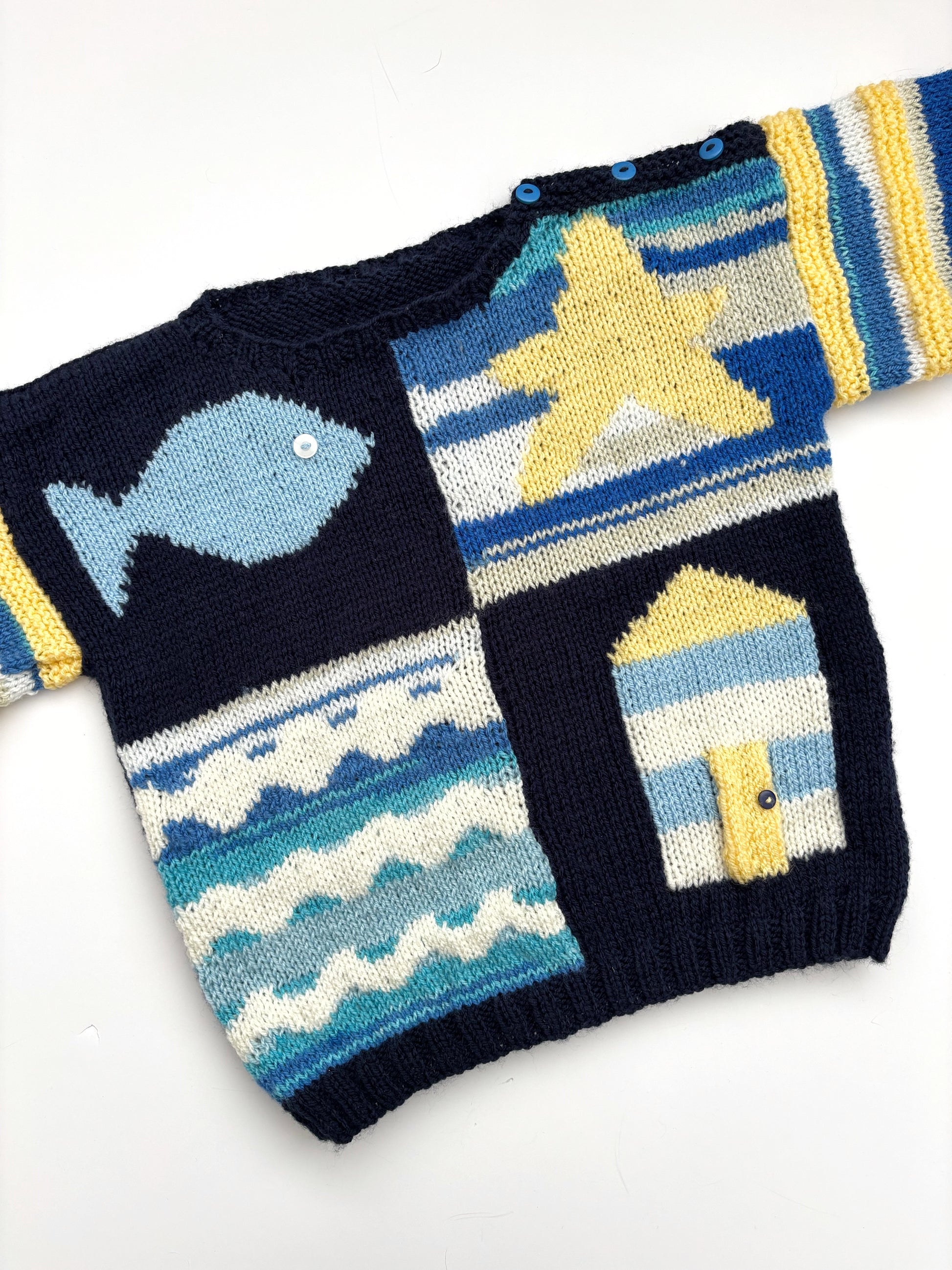 Amazing Handknit seaside themed jumper. Age 3-4 years. Great for summer layering. Great condition. One of my favourite pieces.