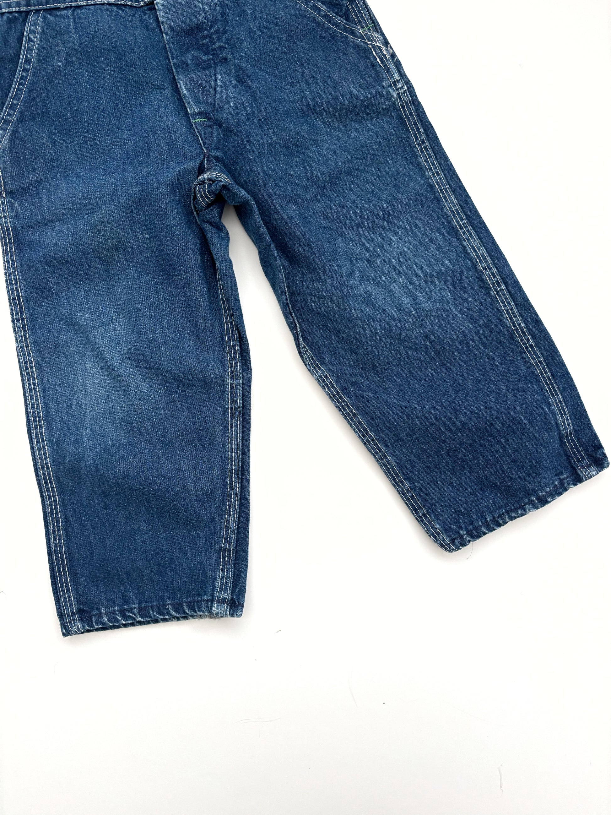These are a key wardrobe piece. In good vintage condition. 1980’s. The size tag has been removed but I’d say they measure up to a 2-3 years for longevity. They can be rolled up. Blue denim with green stitching & brass buttons. Great pair of vintage dungarees. Made in USA.